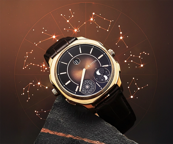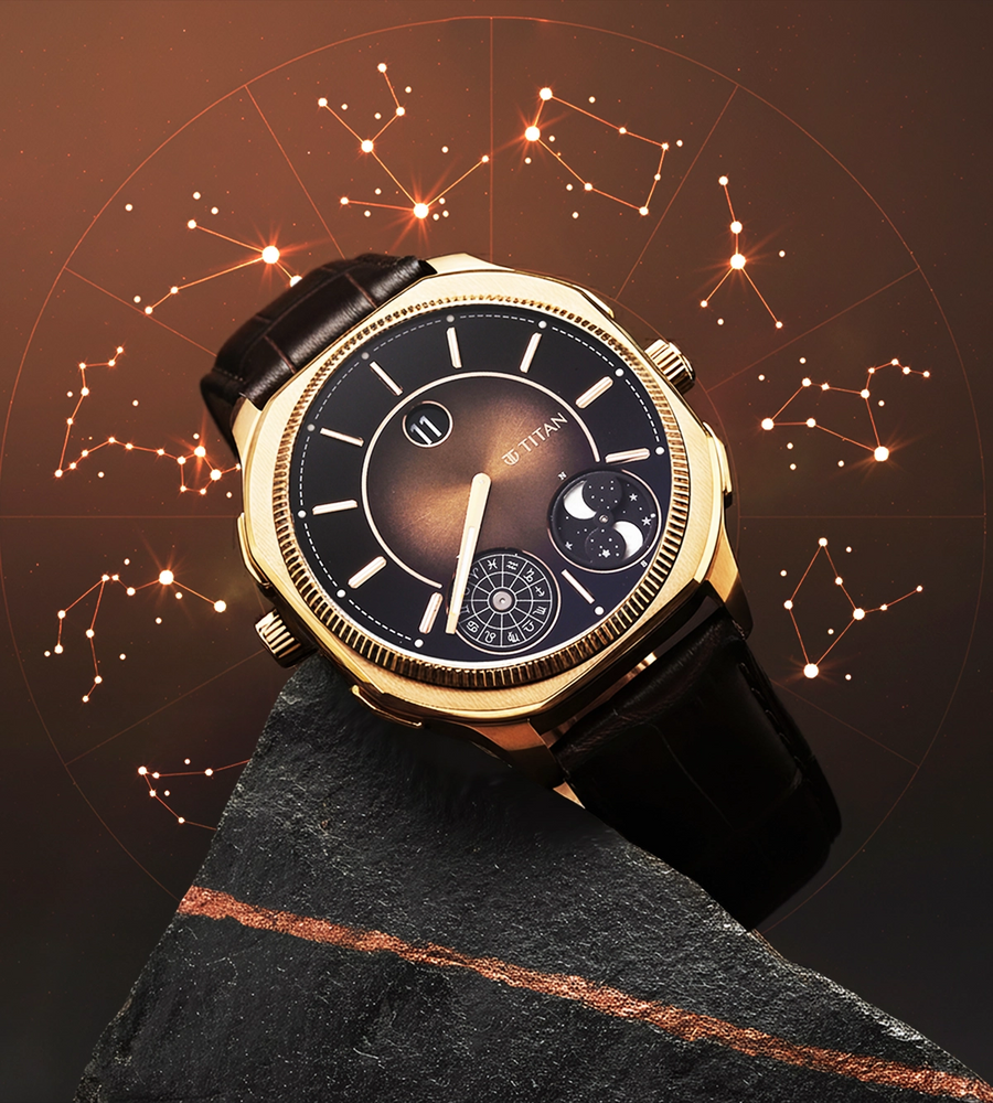 Titan Stellar Zodiac Analog with Dual Moonphase and Jumping Hour and Brown Dial Brown Leather Strap Watch for Men - The Zodiac model celebrates classical astronomy with a functional zodiac disc, dual moonphase, and jumping hour complication. Engraved interpretations on the back case deepen its cosmic storytelling, making it a true horological conversation piece. The watch runs on Titan's in-house Micromotor calibre, engineered for precision and rare complications. Available in Emerald Zodiac and Bronze Zodiac editions, this model is a collector's tribute to the constellations.