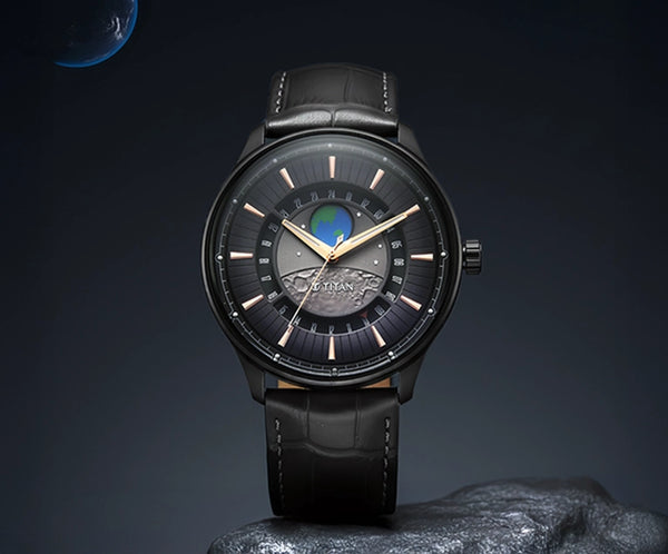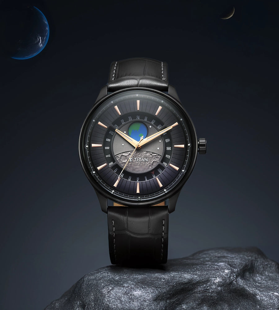 ساعة تيتان ستيلار التناظرية للرجال، مزودة بقرص الأرض ومينا رمادي وسوار جلدي - بفضل خاصية قرص الأرض الدوار، تكشف هذه الساعة عن تغيرات القارات والمحيطات كل ست ساعات. عند الساعة 10:10، يظهر خيال الهند - لحظة مدارية تُخلّد مكانتنا في الكون. تعمل الساعة بحركة كوارتز 7126A داخلية الصنع، حيث يجمع قرص الأرض بين الدقة والفن، ليقدم ابتكارًا فريدًا في عالم الساعات يُغير نظرتك للوقت. اختر بين إصداري "المنظر الطبيعي الرمادي" أو "المنظر الطبيعي الأزرق"، حيث يعكس كل منهما جمال الأرض من منظور مختلف.