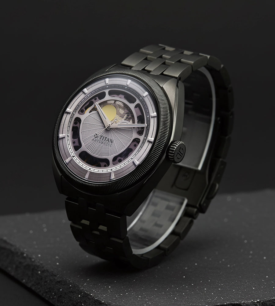 ساعة تيتان ستيلر كوبولا الأوتوماتيكية التناظرية مع مؤشر أطوار الشمس والقمر، ومينا فضي، وسوار من الفولاذ المقاوم للصدأ بلون رمادي داكن، للرجال - مستوحاة من قباب الأبراج وأدوات علم الفلك في العصور الوسطى، تكشف ساعة كوبولا سكيلتال عن عمقها في صناعة الساعات من خلال تصميمها متعدد الطبقات والمفتوح. يُثبّت قرص الشمس والقمر على صفيحة من البولي كربونات الشفافة، مما يسمح برؤية آلية الحركة الداخلية، بينما يزدان المينا المركزي بنقش غيوشيه دقيق بتقنية CNC. هذا التناغم بين الشفافية والملمس يجعل كل نظرة بمثابة اكتشاف. في قلبها، تنبض آلية الحركة الأوتوماتيكية 7A-27 المصنّعة داخليًا، والتي تُشغّل وظيفة مؤشر أطوار الشمس والقمر بدقة متناهية. تتوفر ساعة كوبولا سكيلتال بألوان البرونز المطلي بتقنية IP، والجلد الكلاسيكي، والرمادي الداكن بتقنية IP، وهي تجمع بين روعة التصميم المعماري وفلسفة تيتان العميقة في التصميم.